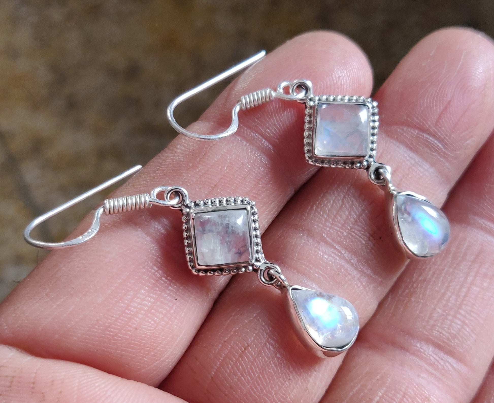 925 SOLID STERLING SILVER NATURAL RAINBOW MOONSTONE GEMSTONE HOOK EARRING