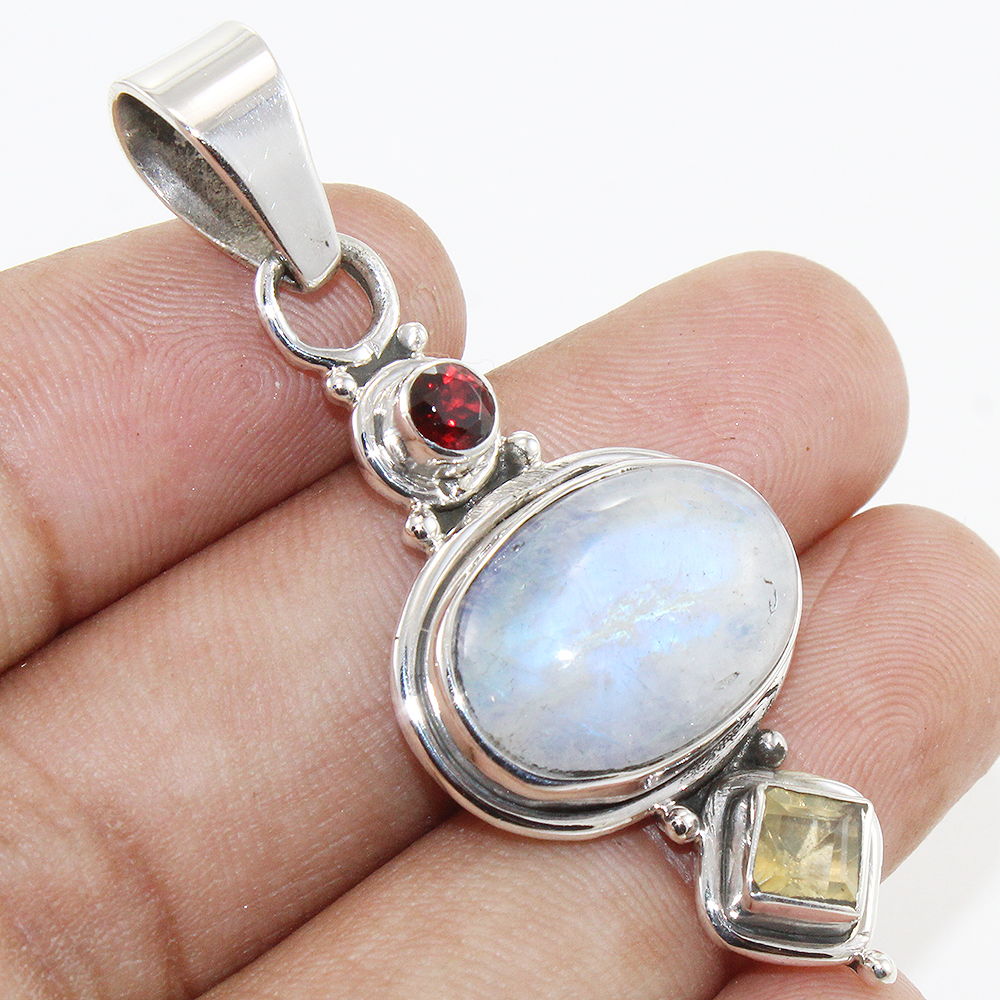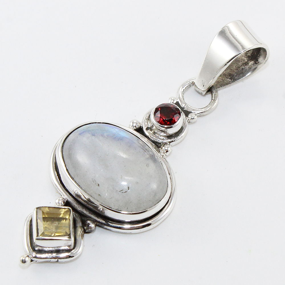 925 SOLID STERLING SILVER NATURAL RAINBOW MOONSTONE, GARNET, CITRINE PENDANT